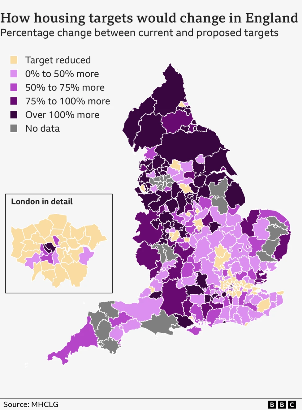In some cases, the housing targets are radically different to those set by the previous government, with rural areas expected to shoulder more of the burden than inner city authorities. Some parts of London have seen their targets go down.